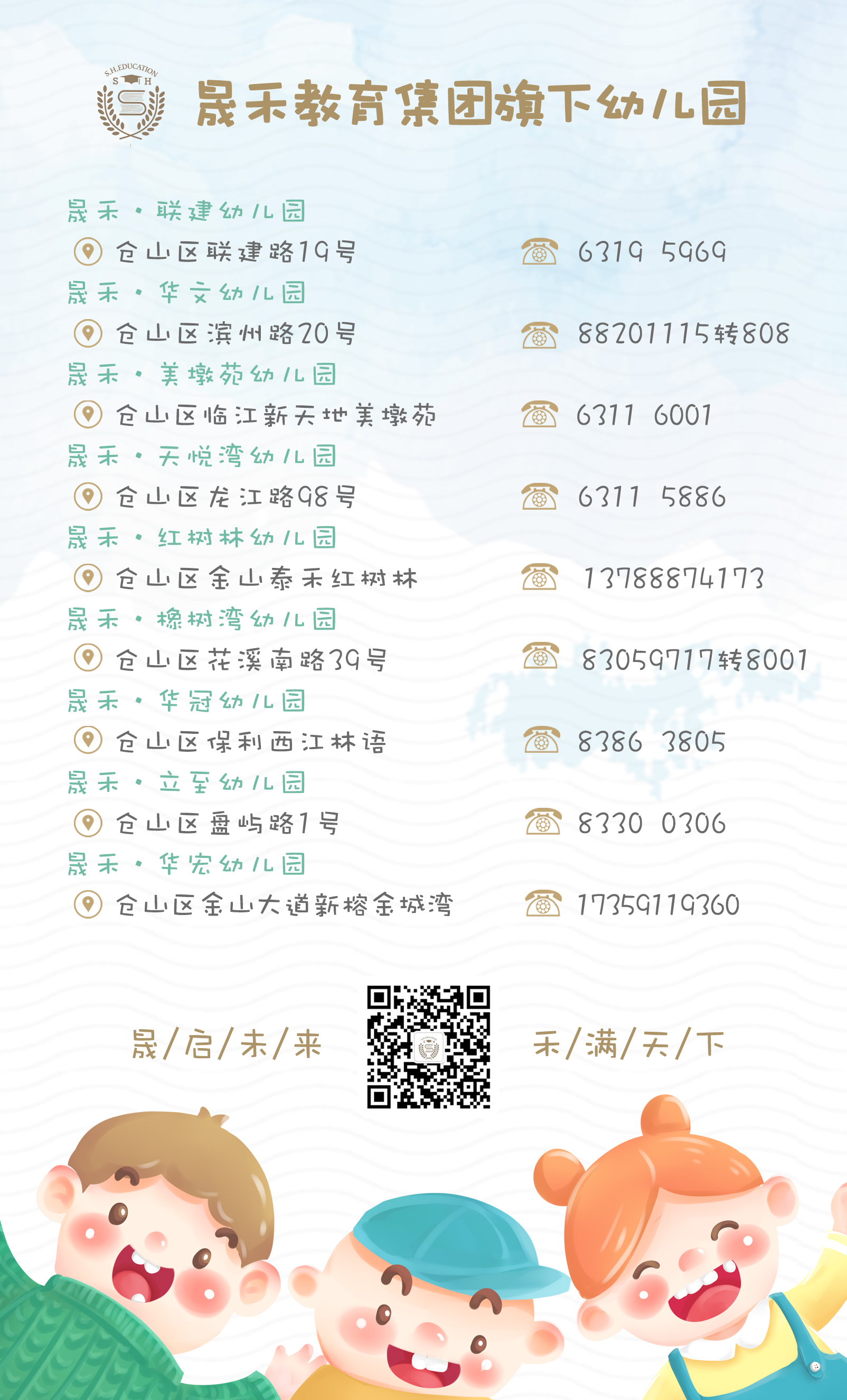 三年多來,按照省級(jí)優(yōu)質(zhì)幼兒園的標(biāo)準(zhǔn)投資了九所普惠性幼兒園,為倉山區(qū)群眾提供5000余個(gè)優(yōu)質(zhì)學(xué)位。在幼教事業(yè)發(fā)展中,晟禾教育朝氣蓬勃,發(fā)展迅猛,站在幼教改革的潮頭,晟禾人立足誠(chéng)信、敢于拼搏、勇于創(chuàng)新,先后獲得了“2019全國(guó)競(jìng)爭(zhēng)力十強(qiáng)民辦教育品牌”、“2019中國(guó)民辦教育百佳學(xué)?!?、“建國(guó)70周年·中國(guó)影響力匠心品牌”“福建省誠(chéng)實(shí)守信示范單位”、“福建省誠(chéng)信教育基地”、“倉山區(qū)誠(chéng)信促進(jìn)會(huì)副會(huì)長(zhǎng)單位”等多項(xiàng)榮譽(yù)稱號(hào)。此外,集團(tuán)還通過了ISO9001質(zhì)量管理體系認(rèn)證、ISO14001環(huán)境管理體系認(rèn)證、ISO18001職業(yè)健康安全管理體系認(rèn)證、重合同守信用企業(yè)認(rèn)證、企業(yè)信用等級(jí)AAA級(jí)認(rèn)證等多項(xiàng)權(quán)威認(rèn)證。