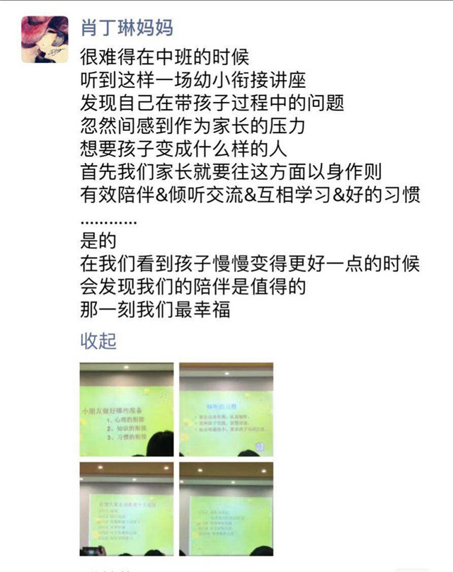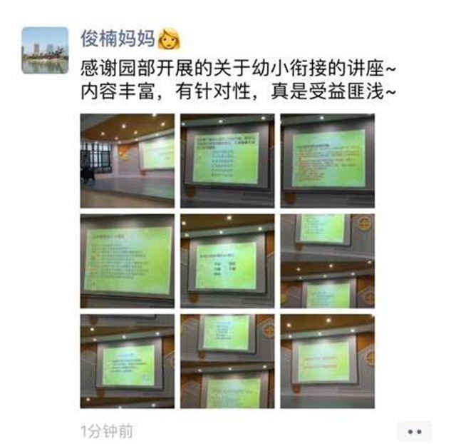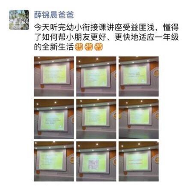 通過此次講座活動,家長們更加明確了大班幼小銜接的具體家庭教育工作,孩子的成長也是父母的成長;家有學童,父母需要調(diào)整和改變;沒人天生會做父母,只有通過不斷反思、調(diào)整,才能成就孩子的成長!最后我們也祝愿大班的孩子們能成長為自信、健康的小學生!