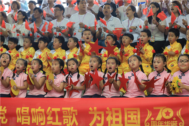 愛國主義情懷教育是思想政治教育的重要內(nèi)容,也是每一個人貫徹一生必修的功課。此次活動的第一個環(huán)節(jié)就是“童心向黨·紅歌拉歌”方陣唱響活動,文藝匯演開始前,小朋友們按不同的方陣圍坐在高蓋山兒童劇場內(nèi),高唱紅歌,歌聲陣陣,感人肺腑,場面十分壯觀。