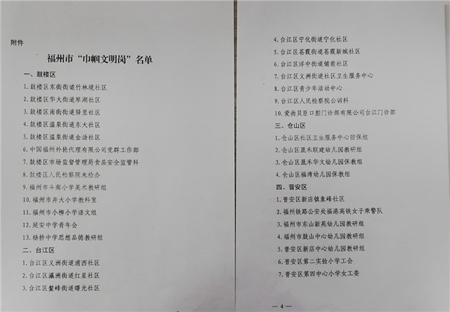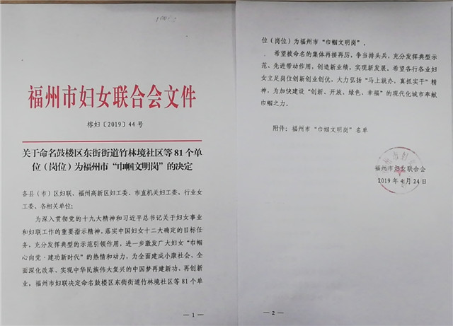近日,福州市婦女聯(lián)合會發(fā)布了《關(guān)于命名鼓樓區(qū)東街街道竹林境社區(qū)等81個單位(崗位)為福州市“巾幗文明崗”的決定》(榕婦【2019】44號)文件。