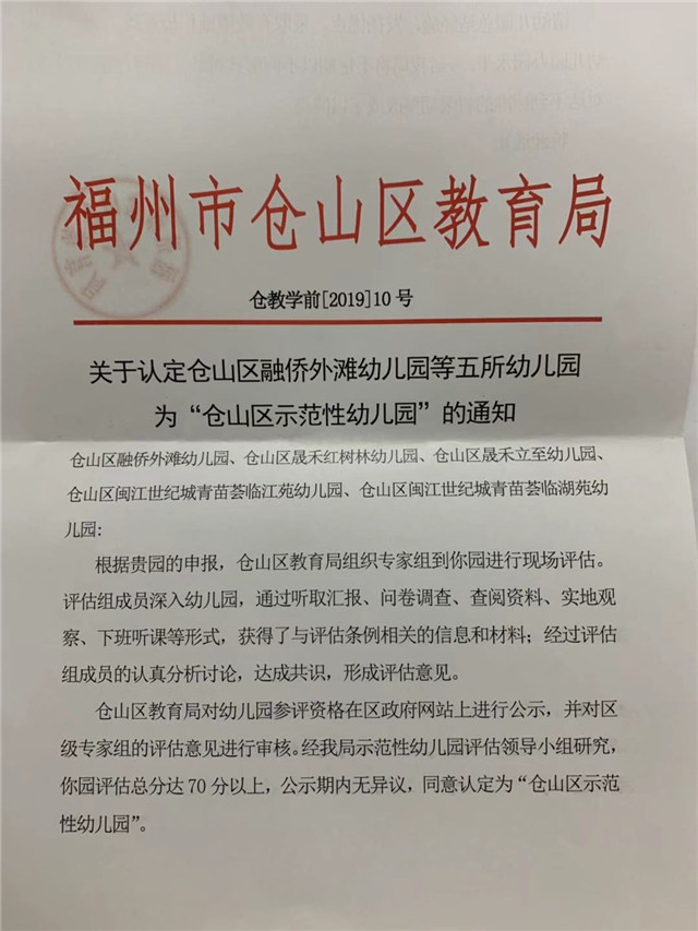 倉山區(qū)教育局7月12日發(fā)布了《關(guān)于認定倉山區(qū)融僑外灘幼兒園等五所幼兒園為“倉山區(qū)示范性幼兒園”的通知》(倉教學前【2019】10號),同意認定倉山區(qū)晟禾紅樹林幼兒園、倉山區(qū)晟禾立至幼兒園為“倉山區(qū)示范性幼兒園”。