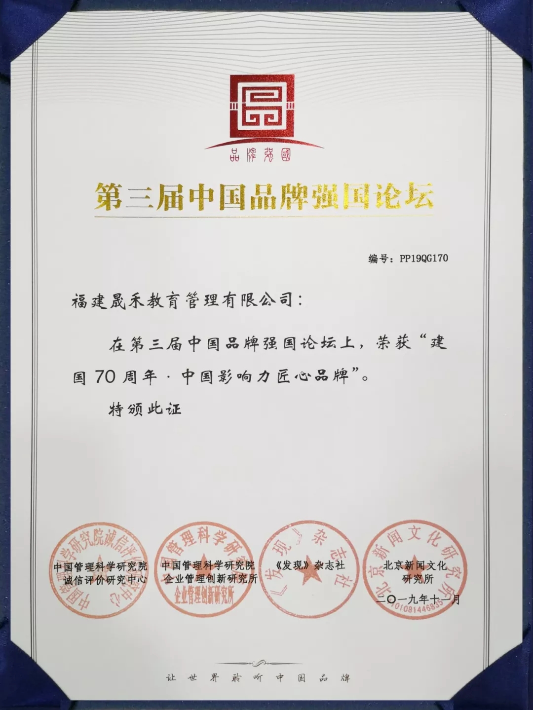 踐行企業(yè)家精神,開(kāi)創(chuàng)品牌價(jià)值新時(shí)代。近年來(lái),晟禾教育集團(tuán)在推動(dòng)行業(yè)發(fā)展、品牌建設(shè)及品牌宣傳等方面取得了突出成績(jī),經(jīng)有關(guān)部門(mén)推薦及評(píng)審委員會(huì)審議,福建晟禾教育管理有限公司榮獲“建國(guó)70周年·中國(guó)影響力匠心品牌”稱號(hào),晟禾教育集團(tuán)董事長(zhǎng)鄭炳榮先生被評(píng)選為“2019品牌中國(guó)誠(chéng)信人物”。