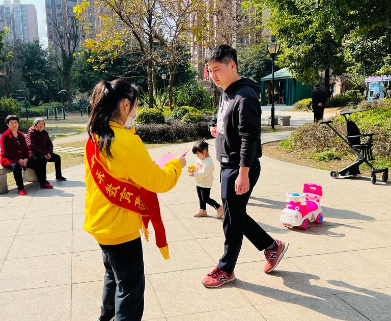 一早,黨員志愿者們在聯(lián)建社區(qū)內(nèi)向社區(qū)居民發(fā)放0~3歲育兒知識宣傳單,宣傳早期教育的重要性,豐富家長們的早教知識。