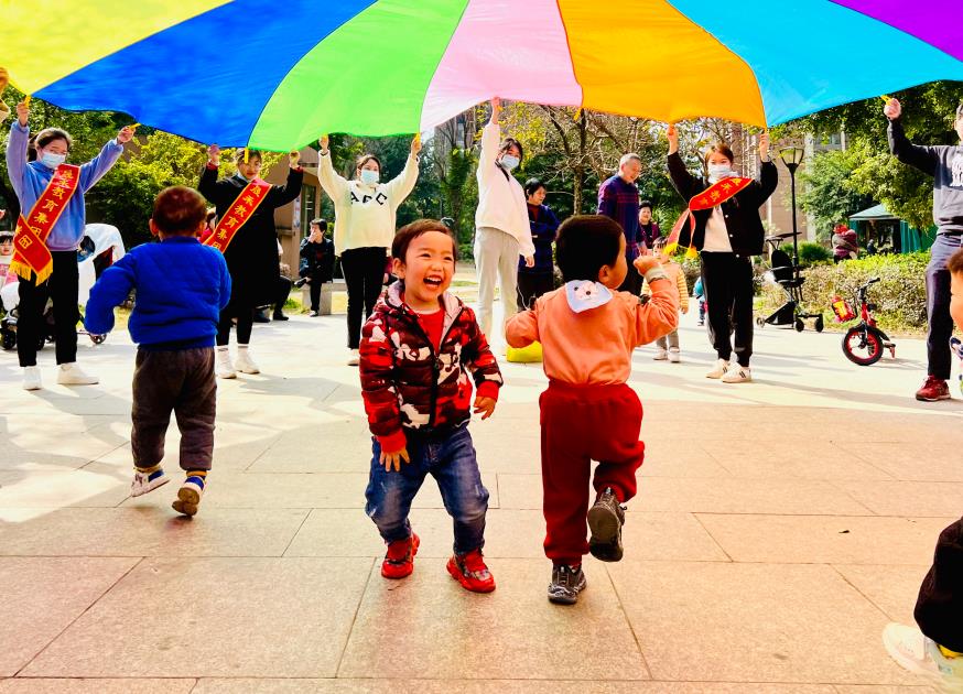 隨后,黨員志愿者們還組織社區(qū)的寶貝們一起進行“彩虹傘”游戲互動。寶貝們剛開始既好奇又怯怯,最終在老師門的熱情感染下,興高采烈地加入到游戲活動中。這些活動吸引著寶貝們和家長的積極參與,增進了家長對早教的認(rèn)識和與寶寶之間的互動。