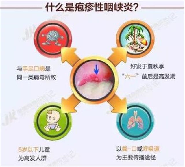 小兒皰疹性咽峽炎是柯薩奇A組病毒所致,好發(fā)于秋季,它是常見的一種具有流行性的病毒性咽炎。臨床特征為驟起高熱伴有咽喉痛、頭痛、厭食,并常有頸,腹和四肢疼痛。