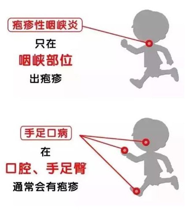 手足口病必須是嘴里、手上和腳上都起皰疹,而皰疹性咽峽炎只有嘴里起皰疹。