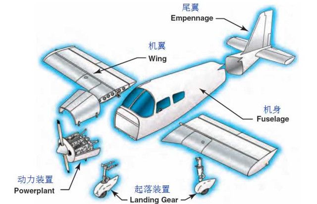 大多數(shù)飛機(jī)由五個(gè)主要部分組成:機(jī)翼、機(jī)身、尾翼、起落裝置和動(dòng)力裝置。