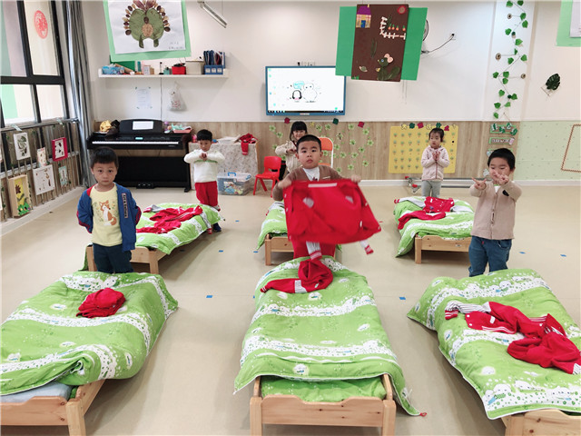 比賽內(nèi)容根據(jù)幼兒的年齡特點設(shè)置:小班段穿鞋、襪;中班段疊衣服、被子;大班段整理書包。